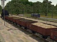 Keskeny nyomközű teherkocsik, üresen és farönk, homok, valamint szén rakománnyal.